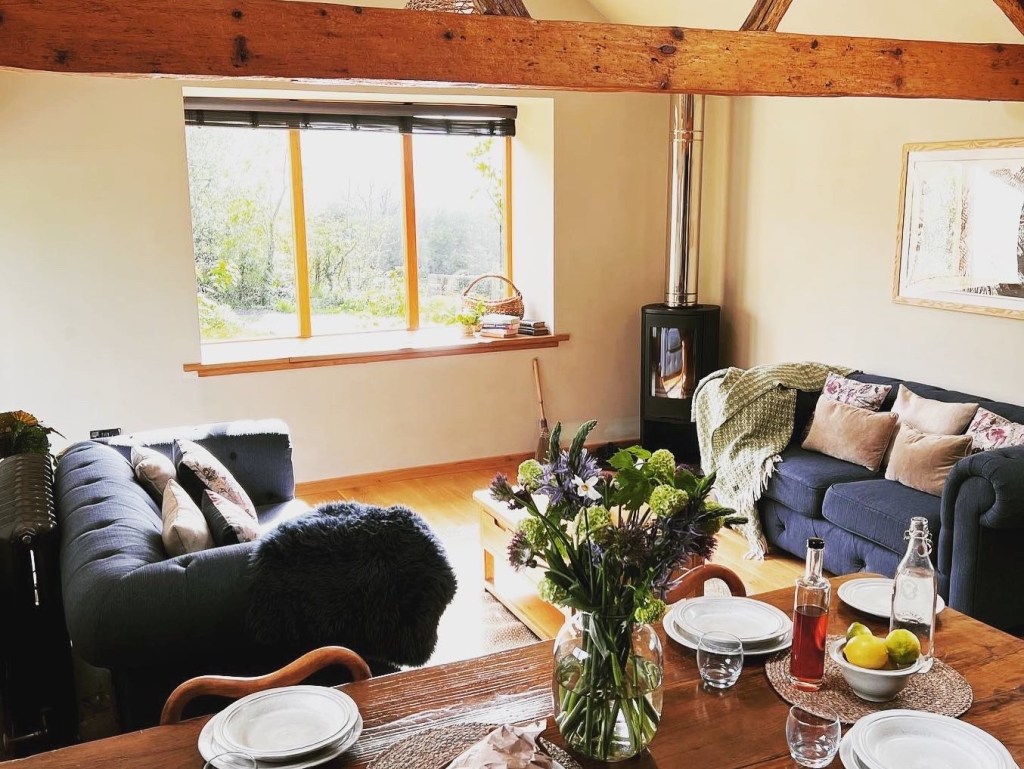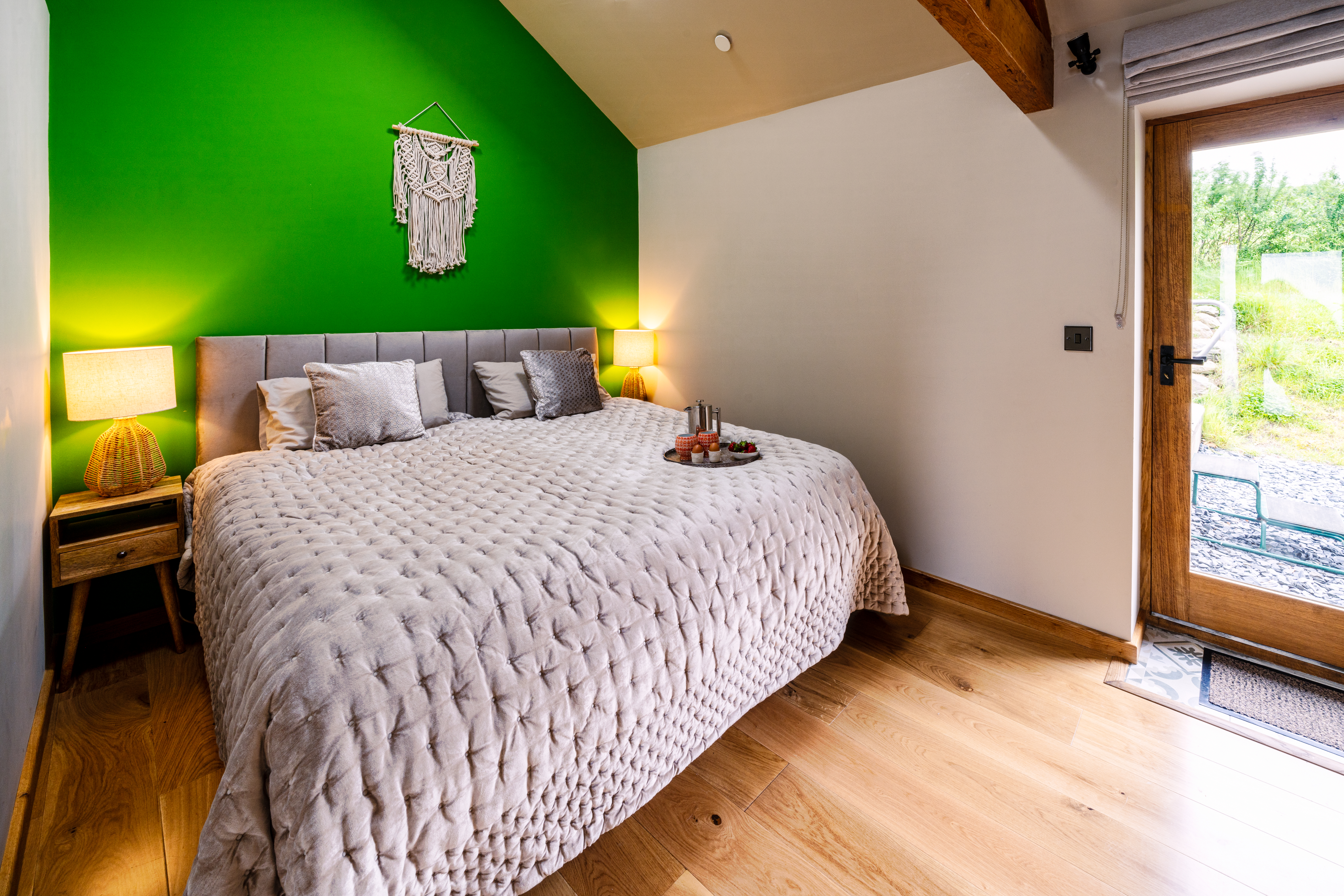 A converted barn in the hills of Snowdonia which has a double bedroom and sofa bed, shower room and kitchen-lounge-diner at one end and a self contained double bedroom with balcony at the other. Guests can soak away in the wood fired hot tub with stunning views and have a BBQ with sunset views over Cambrian Bay. The bedrooms looks out to rolling hills, mountains and sheep fields, with their own enclosed gardens for letting the dog out. It has a BBQ, fire pit and garden furniture perfect for enjoying a beer with friends or family, with stunning sea and sunset views. A comfortable self catering cottage in the winter too, with cast iron radiators and a log burner for those cosy nights in. The lodge has solar hot water heating- enjoy a low carbon shower with no fossil fuels required to heat the water during the summer. Perfect for a couple, an extended family break away or a group of friends. The lodge and it’s exceptional views make for a back to nature get away for walkers, outdoor enthusiasts and those seeking a quiet retreat.