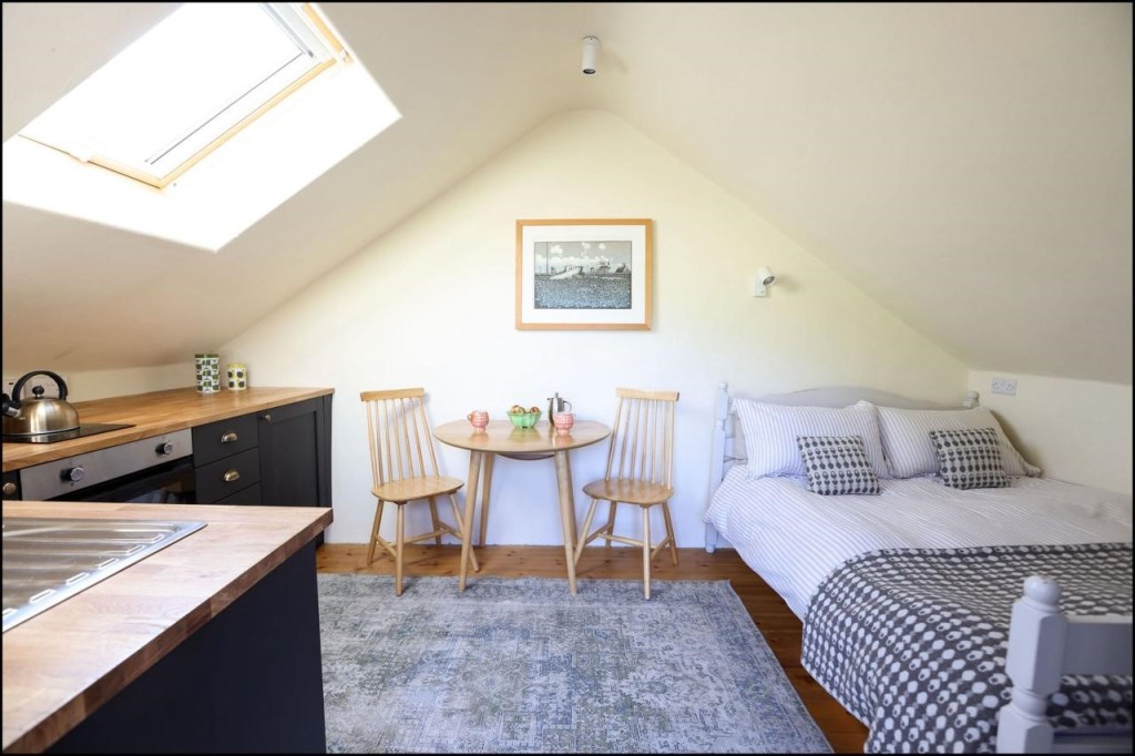 It is perfect for stargazing and in a protected ‘dark skies’ region. The Crogloft has a fire pit for outdoor cooking, a double bed, TV with Netflix & Disney and a kitchenette with twin induction gas hob, microwave and fridge-freezer.